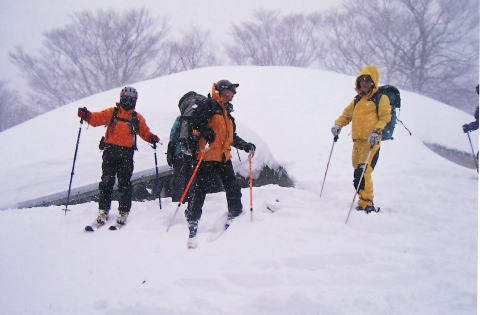 起床後、昨日の食べ残しなど織り交ぜて朝食をとる。さて、外に出てみると、あいかわらずの雪模様。夜の内にさらに雪が20〜30cm積もったようだ。ヒュッテの清掃、雪かきの後、小屋を出る。この間、尾崎(夫)はカッパのおしりを大きく破いてしまい、藤本よりガムテープをもらって応急修理する。とほほ。天候も悪いため、ブン廻しコースを断念、往路下山となる。