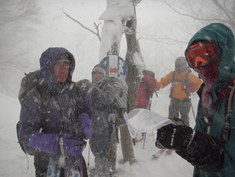 記念撮影の後8:20ヒュッテを出発。視界が良くないので、一団となって進む。一ノ谷上まで順調に進むが、さて急斜面を下降する地点がよくわからない。全員で地図、コンパス、GPSを駆使してルート探した結果、無事に下降地点を発見。自分のルートファインディングの力はまだまだと実感。