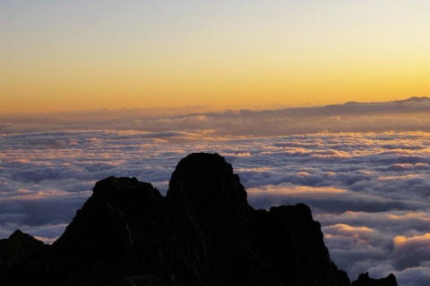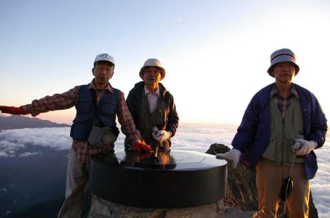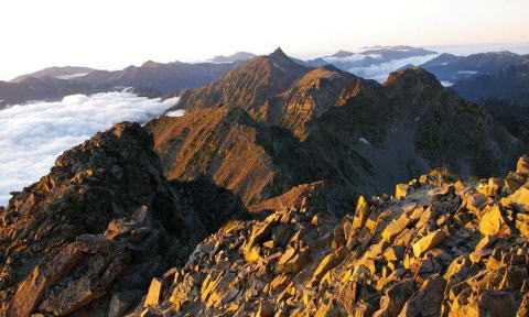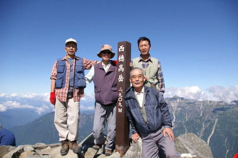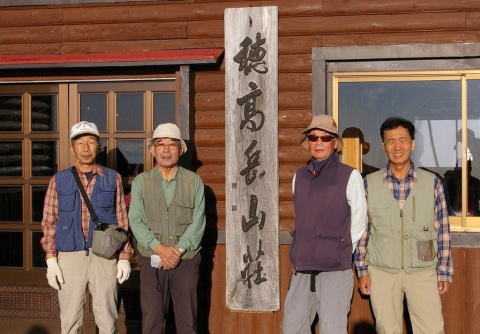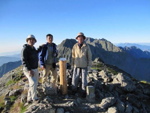 ・山荘を5:00出発。快晴だ。今日の行程は長いので先を急ぐ。 ・6:20 眼前に西穂独標、岩場を登る。 ・8:55 西穂高岳山頂2,909mで記念撮影。 山頂からは奥穂高岳が真正面に聳え立っている。 ・9:20 西穂高岳北面の下りは危険個所、振り返って納得する。 ・11:30 間天のコル、予定時間より遅れている。明るい時間帯に奥穂高岳まで登るきることを全員で確認する。逆層のスラブを登ると天狗の頭だった。 ・14:00 天狗のコルに降り立った。切り立った岩場をクサリを利用しながら、三点支持で登って行くと、ジャンダルムの大岩峰が迫ってくる。 ・16:00 コブ尾根の頭。いつしか畳岩尾根の頭を通り過ぎていた。ジャンダルムは鉄杭とクサリを利用しながら、岳沢側をトラバースする。ロバの耳もクサリを利用しながら高度感あるトラバースをし、眼前の岩峰を直登する。切り立った馬の背の向こうに奥穂高岳頂上が見えた。やがて頂上で待っている壷阪兄を確認、一足先に小屋に下りてもらう。 ・18:10 奥穂高岳頂上 3,190mに立つ。素晴らしい夕焼けの景色が展がる。 夕闇迫る中、パトロール員に記念撮影して貰う。 急いで薄暗くなってきた中を穂高岳山荘へと降りる。途中でとっぷりと日が暮れ、ラテを頼りにクサリ、ハシゴを利用しながらひたすら降りた。出発から14時間が経過した。 ・19:30 白出のコルに立つ穂高岳山荘に到着。他の宿泊客は既に済んで折り我々だけの遅い夕食をとる。