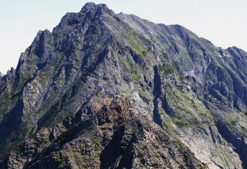 ・6:30小屋を出発。 ・7:00涸沢岳頂上3,110m。穏やかな稜線は僅かだけで急激な降りが始まる。クサリ、ハシゴ、鉄杭を利用してぐんぐん降る。昨日のハードワークで足・膝に力が入らず、ペースがゆっくりとなる。息も直ぐあがる。 ・9:00 涸沢槍。クサリ、ハシゴが連続する長い長い降りを、最低鞍部である涸沢のコルまで降る。今度は一転急激な登りとなり、奥壁バンドをクサリ、ハシゴを利用して登る。 ・10:40 南峰から一旦降って北穂高岳北峰3,110mに登り直す。なかなか手応えのある縦走ルートだった。北穂高小屋で温かいコーヒやお茶を沸かしながら昼食をとり、後続組2人(壺阪、田中信)を待つ。 ・11:50 北穂高小屋から即大キレットとなり、クサリ、ハシゴ、鉄杭を利用して真直ぐに降る。ここで筋肉痛のため、涸沢から上高地に下山する田中信行兄と分かれる。 痩せ尾根になった長谷川のピークにクサリ、ステップを利用して登り、クサリを利用して通過する。何度も何度もクサリ、ハシゴ、鉄杭を利用して直登、浮石の多いザレた所を登りきると、「危険箇所終り、小屋迄10分」の立て看板がある。やっと大キレットが終了した。 ・16:30 南岳小屋着。