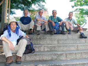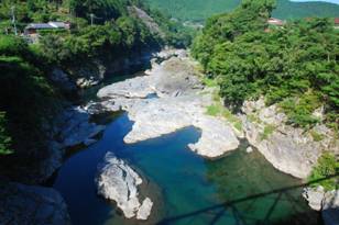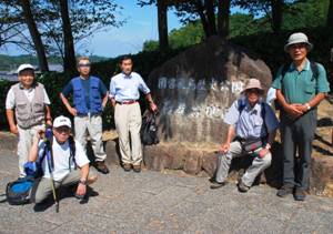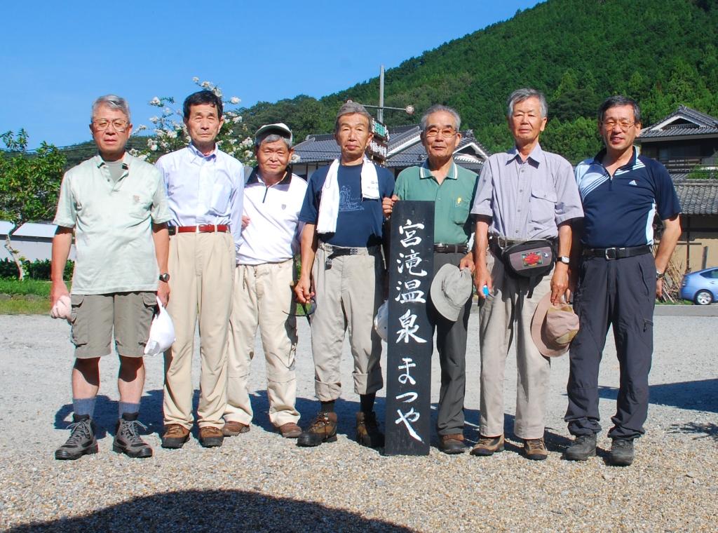 旅館の前で7人そろって記念写真撮影。ここで帰途に着く本澤さんと別れる。旅館を出てすぐに橋を渡る。吉野川の河床は露岩と瀞で水か青々と澄み切っている。古代の天上人たちが楽しんだ景観、なるほど美しい。出発が遅くなったので暑い日ざしの下を歩かねばならないと覚悟を決めて出発したが、谷に入ると木陰を歩くことができてほっとする。