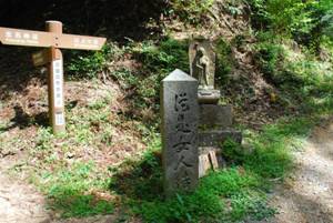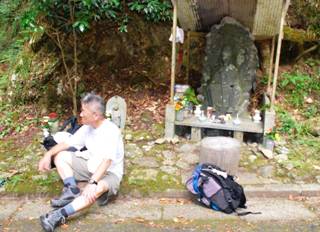 栢森を過ぎてやっと道が谷に入り、木立の影が覆ってくれる。ここまで喘ぎながら進んできた本澤さんのペ-スが遅くなる。暑さにまいった様子だ。途中に脇の沢から清水が出ている場所が2箇所あった。水は冷たくはないが飲むとほっとする。道路が右手にヘアピン・カーブして芋ケ峠に登っていくところに地蔵さんがある。ここから古道が自動車道路から離れて峠に向かう。バラバラに歩いてきたのでここで集合のために休憩。