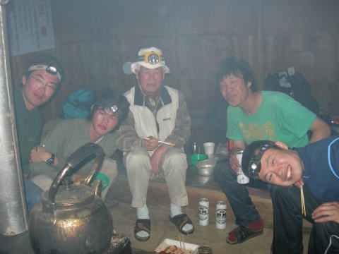 大先輩、壷阪さんを囲んでくつろぐ若者たち左から矢崎(山岳会)、石丸(山岳部新人一年生)、壷阪、吉田(山岳部)、岩澤(山岳部2008年度リ−ダ−)
