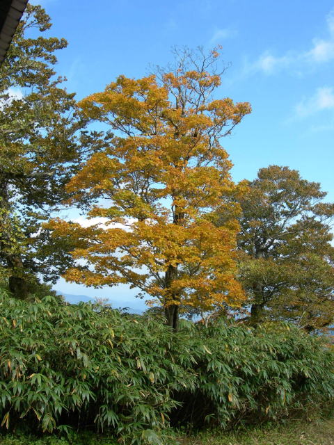 今年は暖冬の影響か?、10月21日(日)の地元の紅葉登山大会当日はヒュッテ南東側のナラ?の黄色が冴えただけでほとんど周囲は緑の多い景色でした。(添付写真↓)