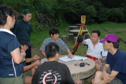 | 折立のキャンプ場で測量実習に励む日中の偵察隊員たち |
