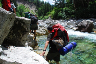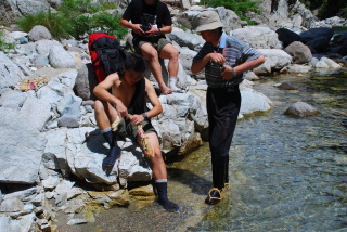 太郎への登りから遅れ勝ちであった牛さんとともに薬師沢出合の小屋に到着すると岩澤君が「公園監視員という名札をつけた人がキャンプできませんよ、と言ってきました。」と困り顔で相談してくる。黒部本流の川原で地下足袋、草鞋に履き替えていると、その監視員がやってきて警告を受ける。「はいはい、では時間も早いし、雲ノ平まで抜けましょう」と応えるとすんなり引き下がっていった。このあたりはキャンプ場が太郎平と高天原にあり、それ以外はキャンプが禁止だとのこと。これらのキャンプ場は従来から沢登をする登山者を対象としたものではないので、黒部の源流を遡行するには沢で夜を過ごさねばならないが、その人達まで規制しなければならなくなったのだろうか。登山人口は減っているようにも思うのだが。地下足袋、草鞋で黒部の源流に入ると水はさすがに冷たい。中国チ-ムは地下足袋、草鞋に疑心暗鬼になっている。水にそろりと入って心配げに歩く。バランスも悪く遡行の速度が遅い。まあ、そのうち慣れるでしょうと気にしないことにした。趙さんは半泣きで渡渉している。日差しが暖かいので気持ちが良い。井上は40年ぶり、山田も30年ぶりで怪しげな記憶で先に進む。赤木沢の出合にあと400mのところから出合まで函が続くのだが、そこで山田の判断で川原にてキャンプすることに決めた。キャンプの目前の瀞には時折結構な形の岩魚が姿を見せている。中国チ-ムはずいぶん疲れたことだろう。晩餐までゆっくり過ごす。夜は星空が美しい。雨の心配はなさそうだ。