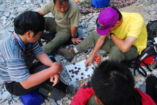 河原で夕食が出来るまでの時間を中国将棋で過ごす董さんと山田。