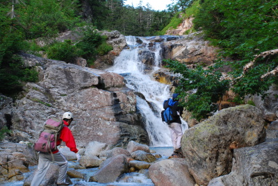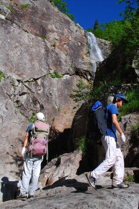 滝は何段かに分かれた連瀑となっている。4人は好きなルートを選んでスイスイと登っていく。山川君は水際が好み、伊藤君は乾いた場所を選んでいく。岩澤は名前のごとく両方を混ぜて歩く。井上は易しい場所選び。楽しいので次々と現れる滝をひたすら登り続ける。一眼レフデシカメを胸にぶら下げた井上は登りにくそうにもせず20代の若者に遅れてはならぬと息を切らす。F-1を過ぎるとしばらくゴーロを歩きF-2の連瀑が現れる。これを過ぎると二三、小滝を越えてゴーロを進む。