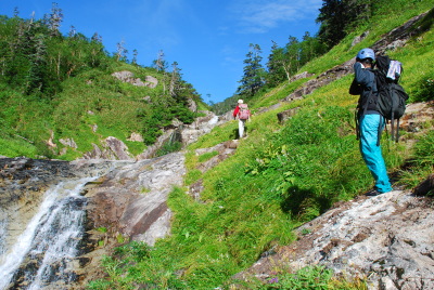 雪渓の残るカールに下る。岩床を流れる清水と高山植物に包まれた広々とした谷は心が休まる。ここらで仰向けに横たわって昼寝でもしたいのだが、若者達は待ってくれない。そんなに急いで何が楽しいのか、山をもっと味わおうよ、と言いたいのだが、声を掛けるには遠すぎる程にどんどん下っていく。