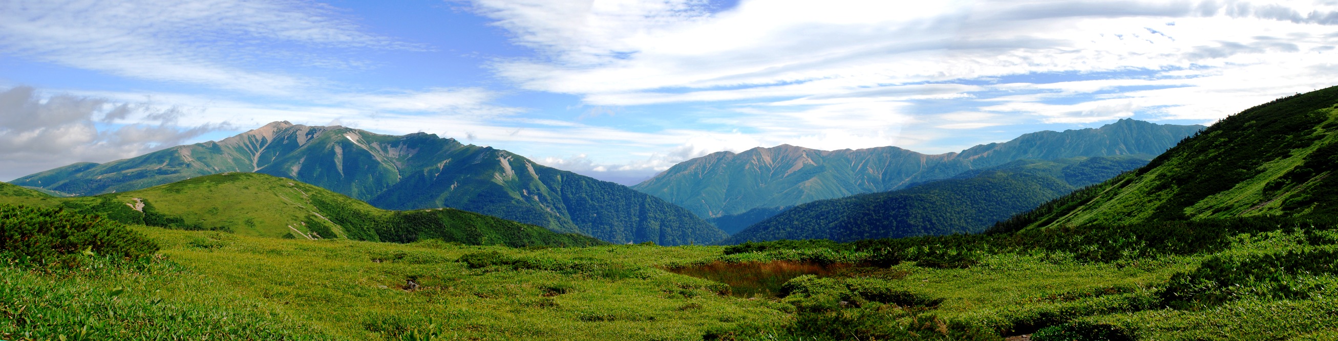 大滝を過ぎると見る見る水量が減少、最後の水流で水筒を満たし、薮との格闘を覚悟して沢から離脱した。ほんの10m程度の藪漕で残雪の消えたお花畑、緑の草原に出た。なんとも心地良い場所である。しばらくこの天井の楽園を楽しんで重走路に出た。こちらから見る薬師岳から水晶岳への屏風も雄大だ。赤木沢を詰めたのだから記念に赤木岳に登ろうかとも言ったのだが、ここから見るとあまり魅力あるとは思えないので衆議一決、先を急ぐことになった。縦走路はにぎやかだった。シルバー組がメジャーである。とりわけ女性が多い。