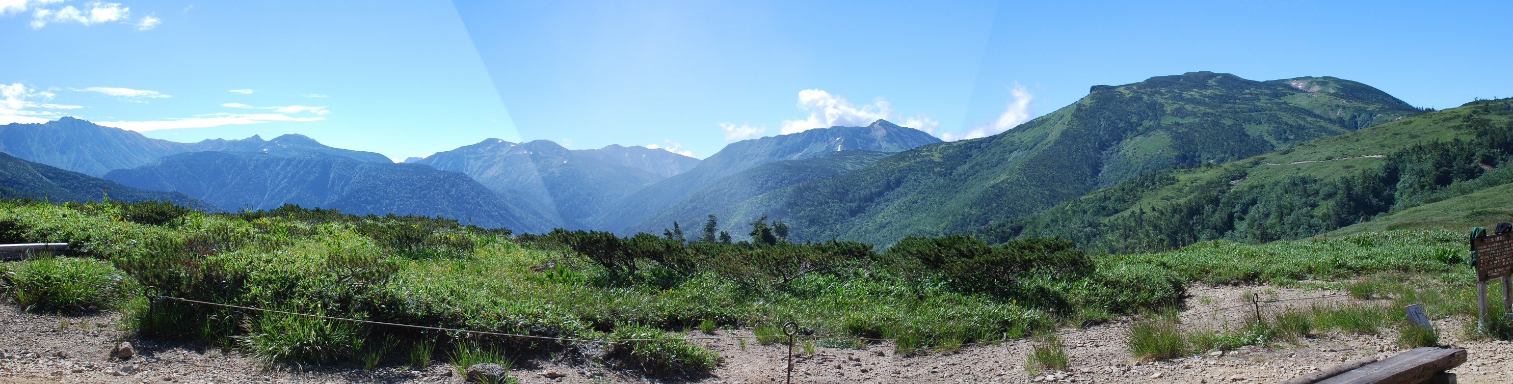 37℃~39℃という猛暑の下界の暑さはここにはないものの日中の日差しはつらい。皆が早めに出発し、出来るだけ高度を稼いでおこうと早足になる。樹林限界が2000m程度の尾根は2196mのピークの登りになると日差しを遮るものがなくなる。薬師岳の山頂越しに朝日が差し込んでくるとじわじわと暑くなりだした。 北アルプスのこのコ-スは人気があるらしく、登山道は良く整備されている。幅広く踏み荒らされて地肌がむき出しになった歩道の両側に莚を敷いて植物が再生するように手入れされている。