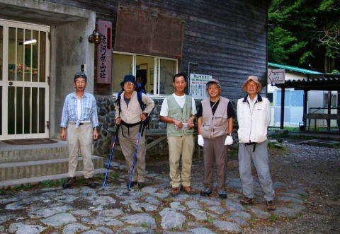 写真-3 (広河原山荘前で記念撮影、右から壺阪、本澤、井上薫、田中俊、田中信)