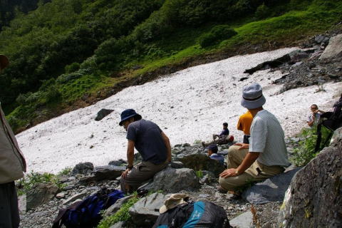 写真-4 (雪渓が残る二股で休憩中の俊さん、井上薫兄)