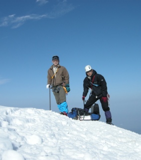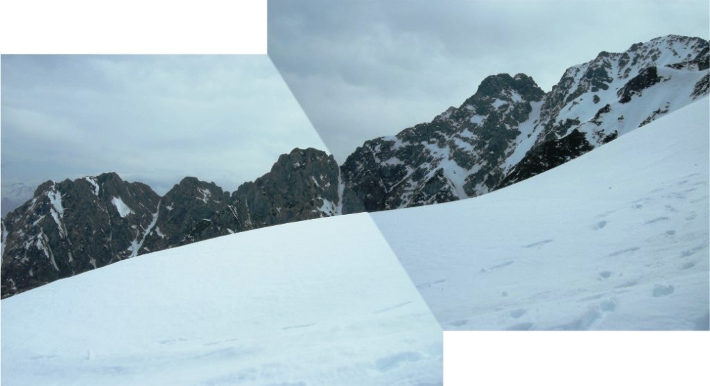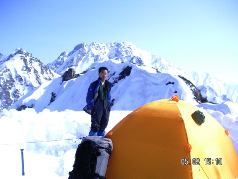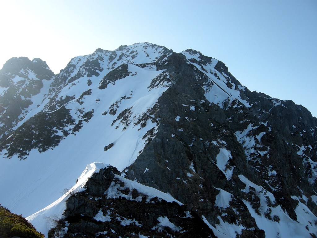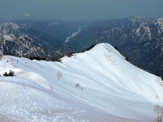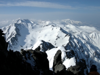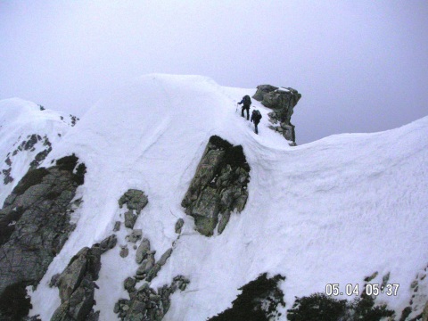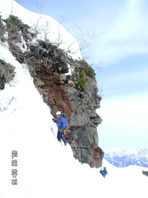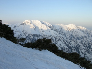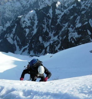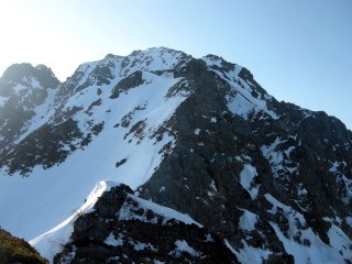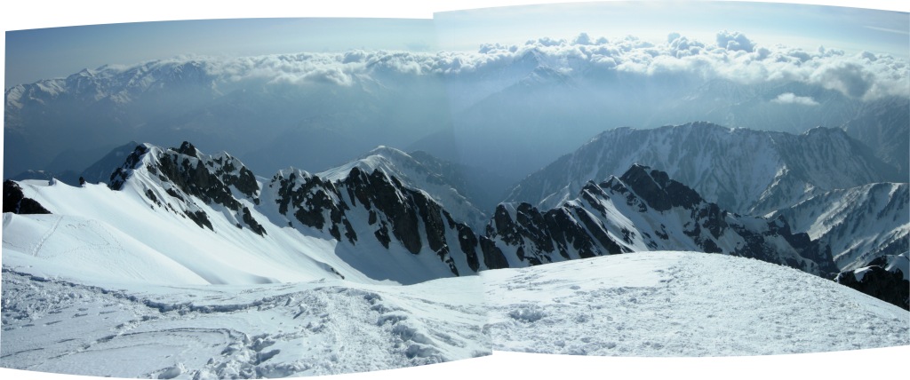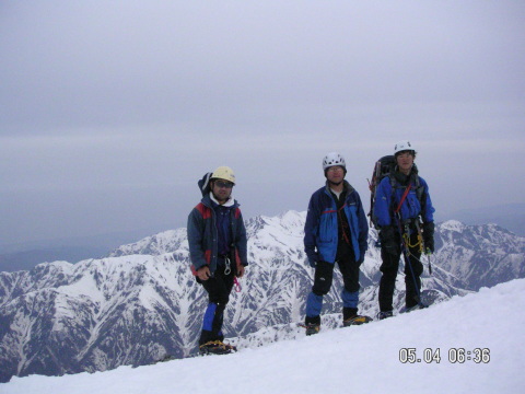 天気予報は5日は雨模様とのことであったが早朝は快晴無風で絶好のアタック日和となる。クラストしてアイゼンが良く効くスノ-コンディションの下に登頂。頂上直下の氷化したルンゼはアプザイレンで、2700m付近の雪壁はワンアットで下降。