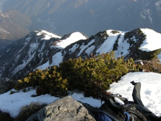 早月小屋の下(標高1700m付近)で、これから入山する早月尾根パーティ(井上、近藤)に出合った。藪尾根、雪稜、岩峰と変化に富んだよいコースでした。積雪量が少なく天候にも恵まれて、思っていたよりハイペースでこなすことができました。 (山本 記)