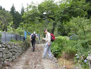 民家の庭先に谷の水が引いてある。冷たくて美味しい水で疲れを癒す。