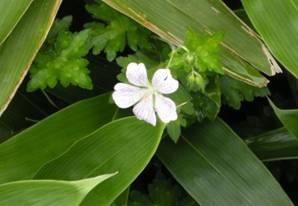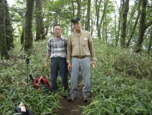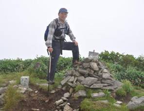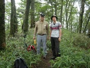 尾根筋の登山道は笹原の中を行く。所々フウロ草などの花々が咲いている。笹が瑞々しい葉を伸ばしている。笹は背丈が高いところで腰まで、低いところでは膝ぐらいまでで視界をさえぎることがないので不快感がない。薄いガスが山脈全体を包んでいるので視界は良くない。きっと瀬戸内海や松山の街並み、そして南にはひょっとして太平洋が眺められるのではないかと想像しながら二ノ森に急ぐ。アザミの花がたくさんある。綺麗のだが、チクリチクリと手足を刺す。トウヒの木が結露を促進して北斜面の笹が濡れている。ズボンを濡らす。笹に覆われた足元が時々踏み跡に出ている岩を隠していて、これに躓いたり滑ったりで気を使いながら登った。二ノ森に着くと登山者一人が休んでいたので山田の新しいニコンのカメラで記念写真を撮ってもらった。