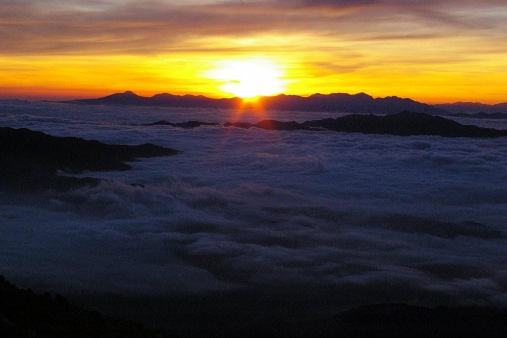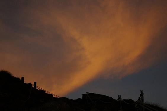 やがて日没を迎えた。余りにも遅いと山荘から助っ人2名が出動、出合うなり夜間登山は危険と説得され(18:30)、後発組の二人は手前の王滝頂上山荘泊り(19:10)となった。 ●8月30日(月)快晴 4時半に起床、モルゲンロートを撮影するべく羽毛服を着て山荘を飛び出す。