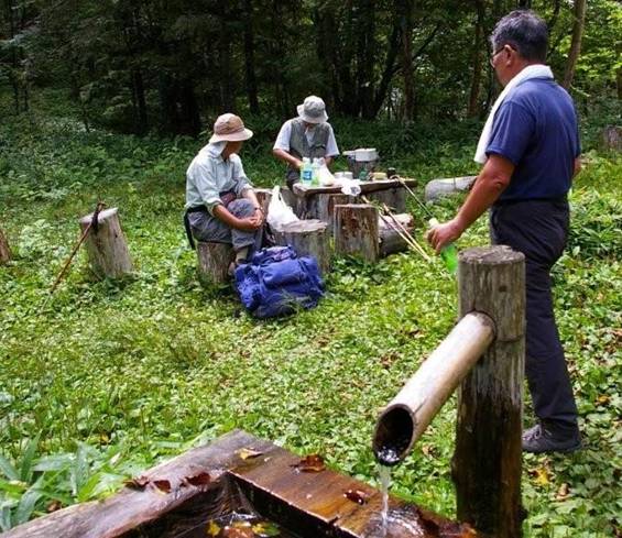 ヨナ沢の頭で昼食(10:50)。小地獄・大地獄の悪路は鎖場とハシゴの連続だった。樹林帯に入り、新池山小屋で休息(13:00)。