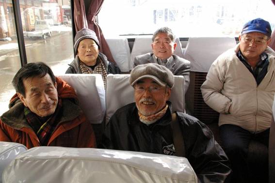 写真C1月11日(晴れ)スキーツアーバス車中にて、前列左から金井、橋本、後列左から本澤、小谷、原田の各兄