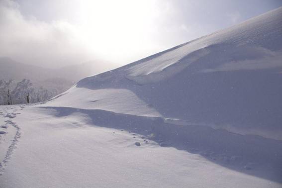 下山開始(15:00)、冬山の厳しさを思い知らされる。ザンゲ坂は急斜面で巾が狭い上に視界不良で前方が見にくく下降に難渋する。圧雪面と新雪面の区別が付かず、簡単にスキー板を取られて転倒する。パラダイスゲレンデに着いてほっと一息つく。これからは昨日滑ったコース、視界も幾分良好になった。ロングダウンヒルのパラダイス・大平コースを一気に滑走して蔵王温泉スキーの醍醐味を味わうことが出来た。