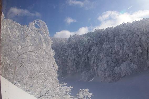 写真K1月14日(快晴)休息した三五郎小屋の窓から見た蔵王の樹氷群。