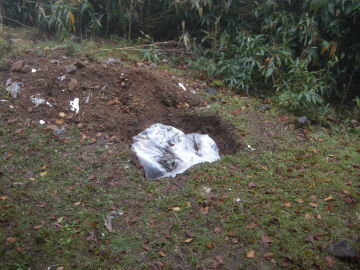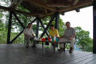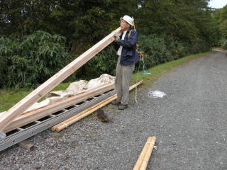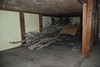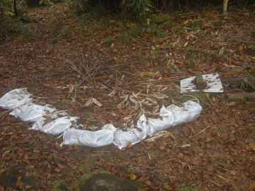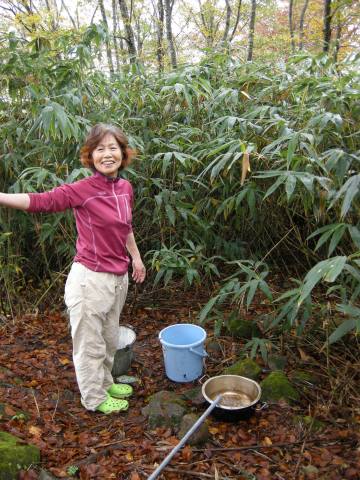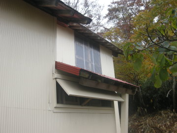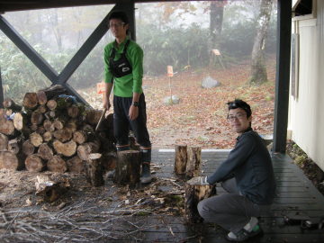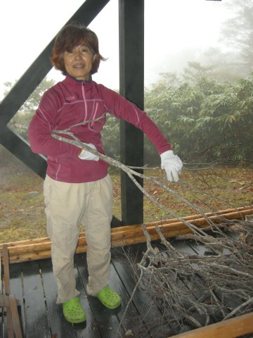 10月14日に井上達と妻、それに現役の岩澤、阪本が先発として入山し、整備の残作業を実施しました。 主な作業は 1. トイレの汚物の除去と埋設、およびトイレット・ペ−パ−ホルダ−の取り付け 2. 水道の復元 3. 2F蚕棚に保管中のブナの枝の薪化と拭き掃除 4. 備品と記念登山の食料の荷揚げ 5. 階段に握りバ−取り付け などでした。9月23日、24日に荷揚げした塗料や建材はその後、正垣木材殿が施工。
