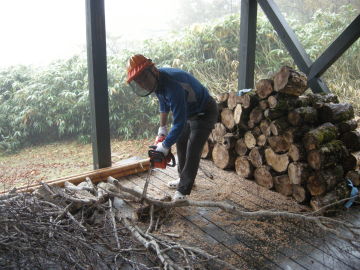 台風12号が猛威を奮って氷ノ山も被害にあいました。大段平への林道は福定も横行も鵜縄も遮断され、当初予定の9月9日、10日の整備登山は注視となりました。その後の情報で横行ル−トが何とか通行できることが判明し、整備登山を実施しました。 ◇ メンバ− 土山 井上達 現役: 坂本 松尾 金 ◇ 主な整備内容 1. ブナの倒木の薪化 ---- Cahin sawにて玉切り、デッキに積み上げ 2. 水源への未知の笹刈り取り 3. 2F蚕棚の薪処理と清掃 4. 塗料一斗缶 6本 荷揚げ、建築資材荷上げ 5. ランタンなど設置