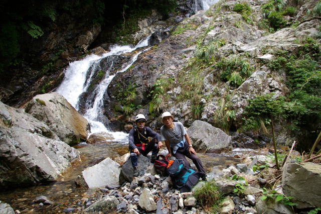 葛川坊村町駐車場(比良山荘奥)から徒歩1時間、9時40分に明王谷(本谷上部)から遡行を開始し、奥の深谷に入りました。シビアーな岩登りを経て、11時に4段40mの滝で休憩。
