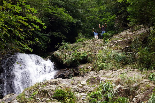 予想した以上に滝が連続しており、胸まで浸かって釜を突破する。ガイドの岡市兄の動きは敏捷で、腰までの水濡れで済ませました。