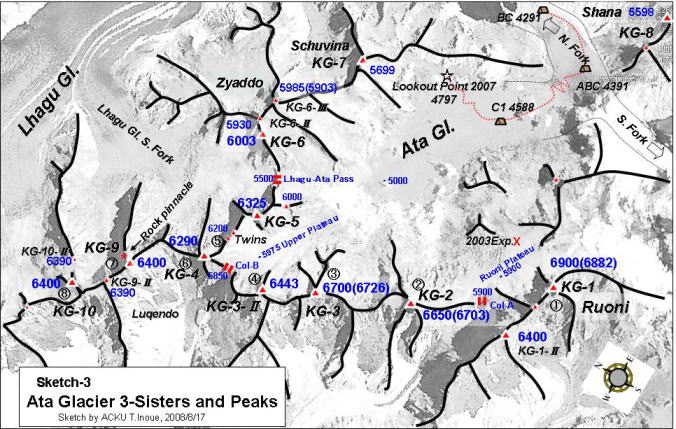 routes to the peaks of the Ata 3-Sisters (nick-named KG-1 Mt. Ruoni 6805m,