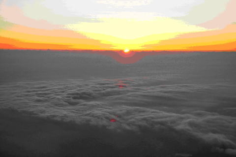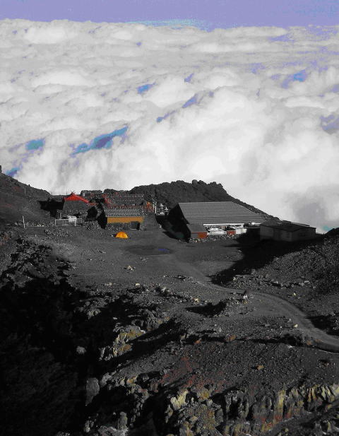 が営業している最後の小屋で、この上の施設はすでにすべて閉鎖している。体を慣らすためにゆっくりと上る。新七合、元祖七合、八合、九合、九合五勺と各小屋で一休みしながら上る。3400m以上になって雲海の上に出て晴れる。1時30分富士宮頂上。郵便局の裏の平坦地にテントを張る。一休み後、剣が峰へ上る。GPS測位で高