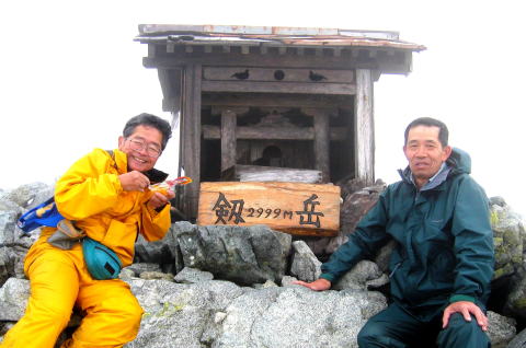 夜中の猛烈な風も幸い治まってきているので、視界は悪いが出発。すぐに出てくる2ヶ所の残雪を慎重にトラバースし、あとはただただ登るのみ。霧の中、ペンキ標識を探し探し登るので時間を食う。残雪や雪渓で標識が隠れたり、さらには標識の全くないところも多々あり苦労する。前剱を越えると難度が増してくる。トイレのある平蔵谷のコルから、鎖、25段のはしご、カニのヨコバイの鎖場と連続踏破、その上の岩礫地をぐんぐん登る。傾斜がゆるんだところで前方を見ると、20mほど先にぼんやり小さな屋形の輪郭が見えるではないか。やった!頂上の祠だ。座ってベッタさんを待つ。現れた彼、祠に全然気付かない。注意喚起。気付いた顔に満面の笑みが浮かび上る。そろって残りの20mを歩き山頂。「剱2999M岳」の看板。川越君差入れのでっかいフルーツゼリーで登頂を祝う(写真3)。うまい。ありがとう。帰路も慎重に下り(写真4)、雷鳥夫婦にも会えた(写真5)。12時間半のアルバイトで無事雷鳥荘に着き銘酒立山で乾杯、ゆっくり温泉に浸る。