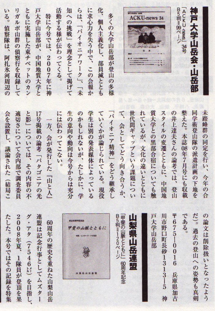 岳人参考までにACKU news 34号を送付したところ書評が掲載されました。