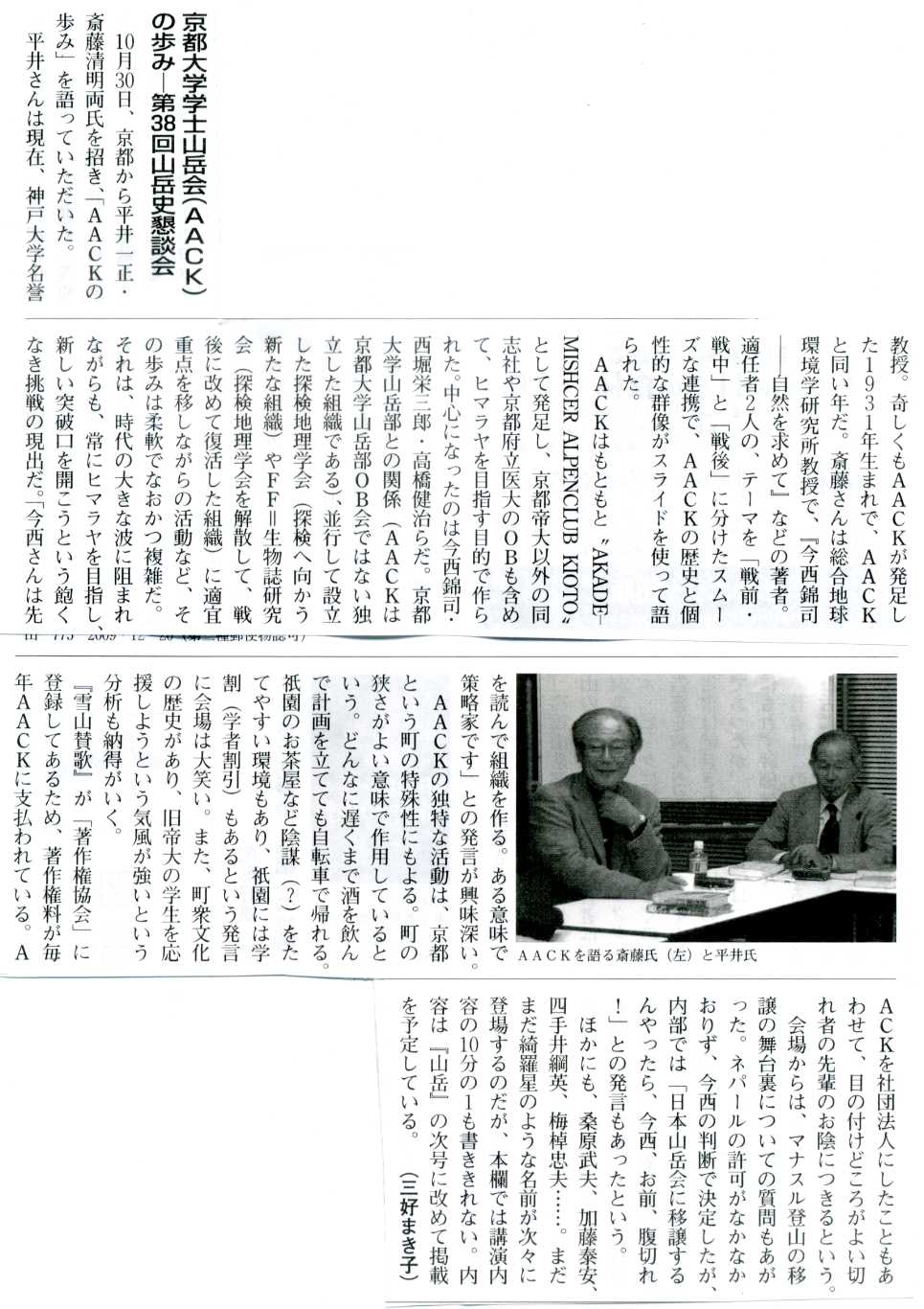4月号に「ACKU news34号」の書評を掲載していただきありがとうございます。前回のe-mailでコメントしましたように、これは会員や関係者への配布を意識したものであまり方向性を持たせて編集しているものではありません。今回は現役山岳部から投稿がなかったのが残念です。書評でちょっと気になったこと2点。