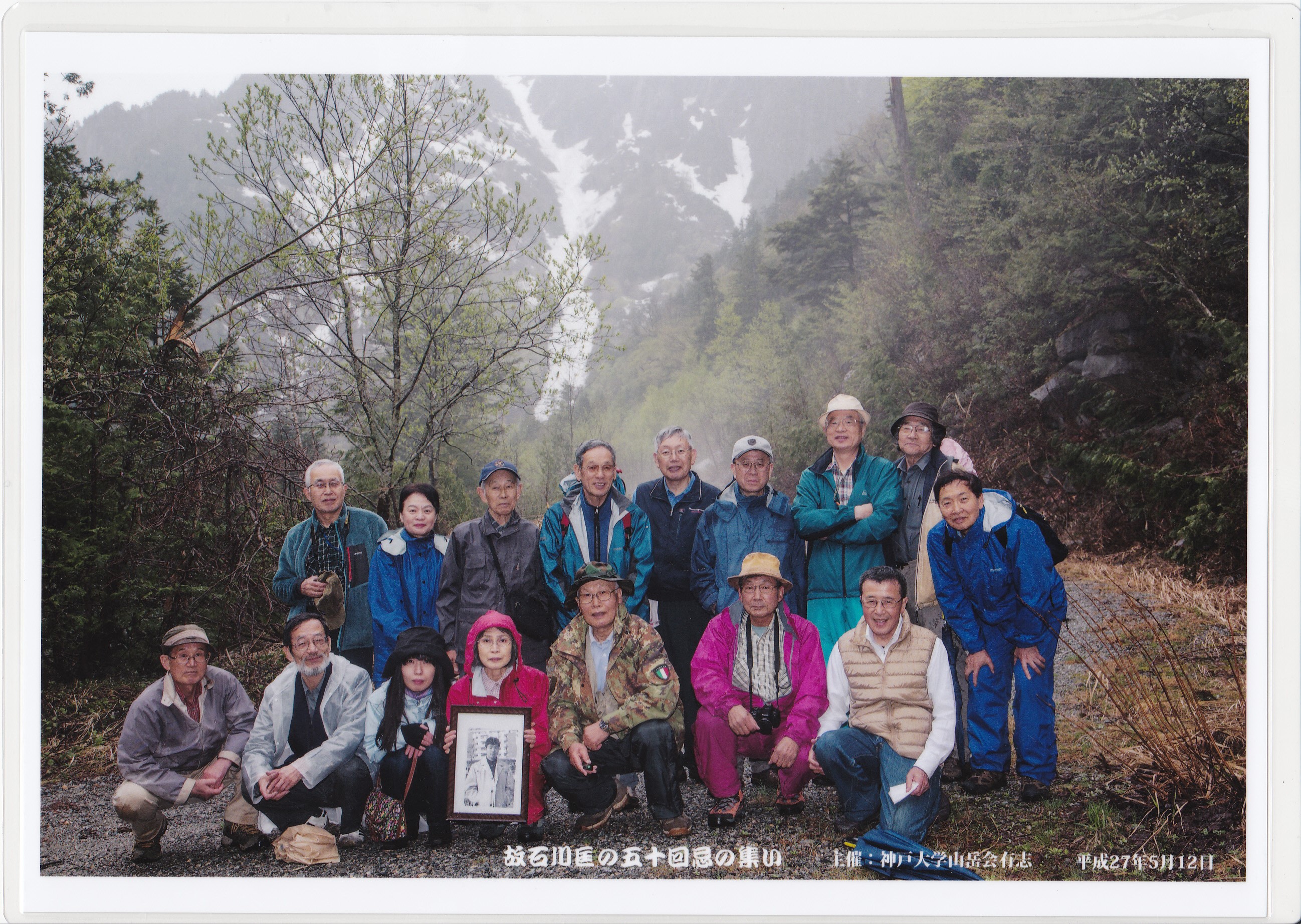 2015年5月12日、新穂高温泉にて故石川匡氏の50回忌の集いが新穂高にて開催されました。蒲田川左股の右岸(下から数えて二つ目の橋を渡ったところ)のレリーフ前にて井上薫会員を導師に法要、平井一正名誉会員、井上達男会長の挨拶に加えて山岳部同期の中園卓爾会員の追悼文朗読がありました。生憎の雨でしたが強くならず無事に終えました。