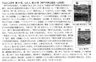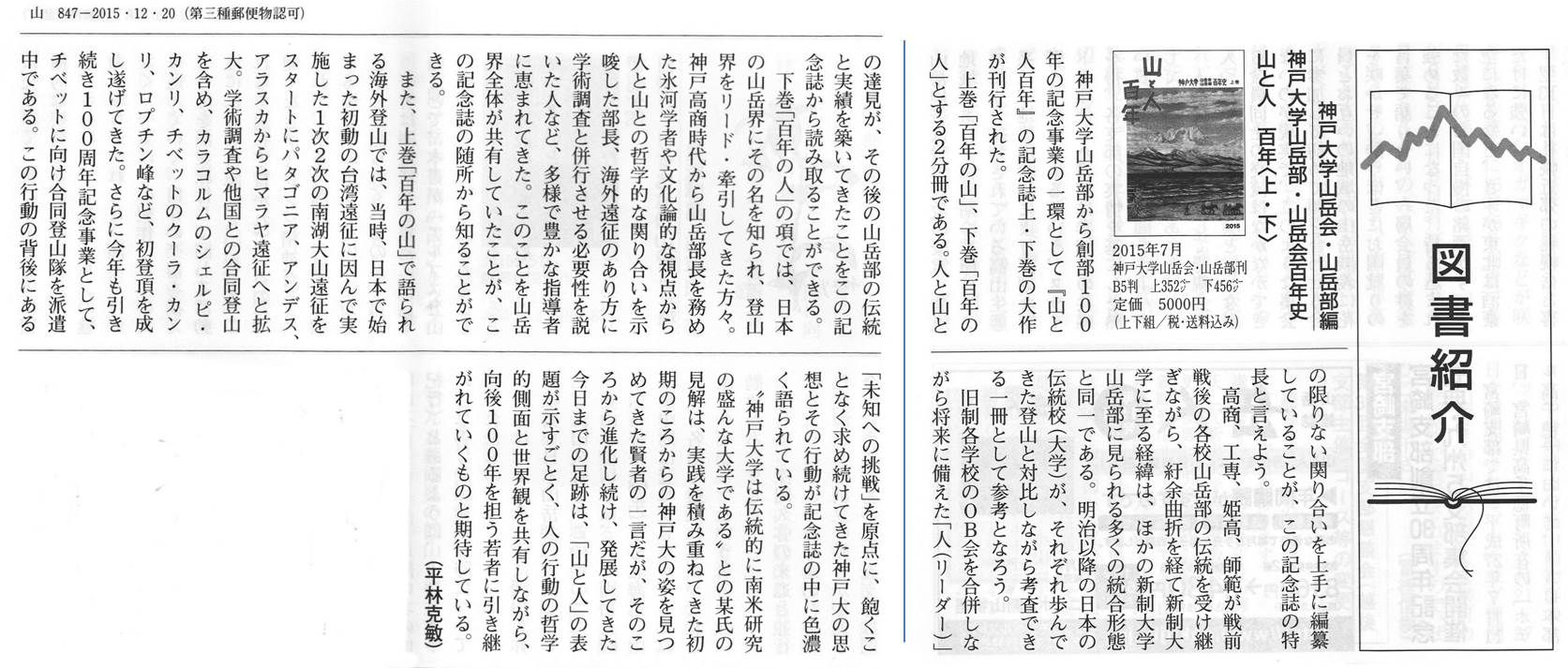 日本山岳会の月報『山2015年12月号」に平林克敏氏(同志社大学山岳会元会長)が「山と人百年」の書評を書かれて掲載されています。